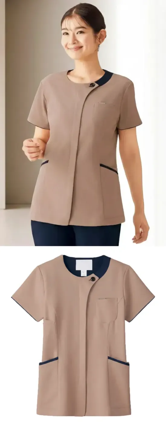 ・ノンPUストレッチ素材で快適な伸縮性と動きやすさを実現・吸汗速乾性に優れ、長時間の勤務でも快適・着脱しやすいシップタイプ・機能的な携帯電話ポケットで必需品をしっかり収納・2重仕様の左胸ポケットで小物の整理がしやすい・タブレットサイズのポケット搭載で電子カルテにも対応・右腰の便利なループと左右小分けポケットで収納力抜群・折り返して使える袖デザインで体温調節も自在