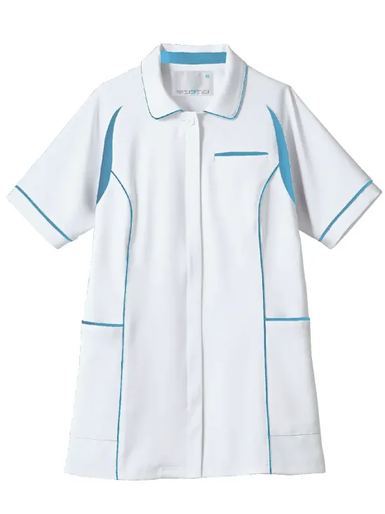 ・白ベースに映える配色ラインがアクセントに・動きをサポートするパターン設計で、肩まわりの動きもスムーズ・汚れが目立ちにくい襟裏アクセント配色を採用・ラウンドカットデザインで、ヒップラインを自然にカバー・制菌加工により、繊維上の細菌の増殖を抑え清潔を保ちやすい
