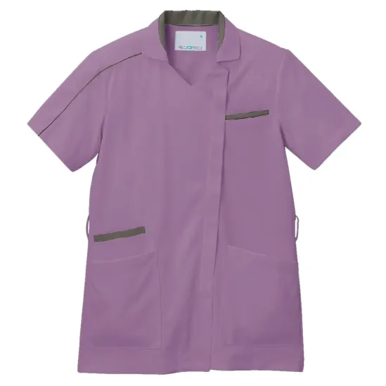 襟付きデザインできちんと感を演出する男女兼用ジップアップスクラブ。表情を引き締める配色効果がアクセントとなり、上品で清潔感のある印象に。