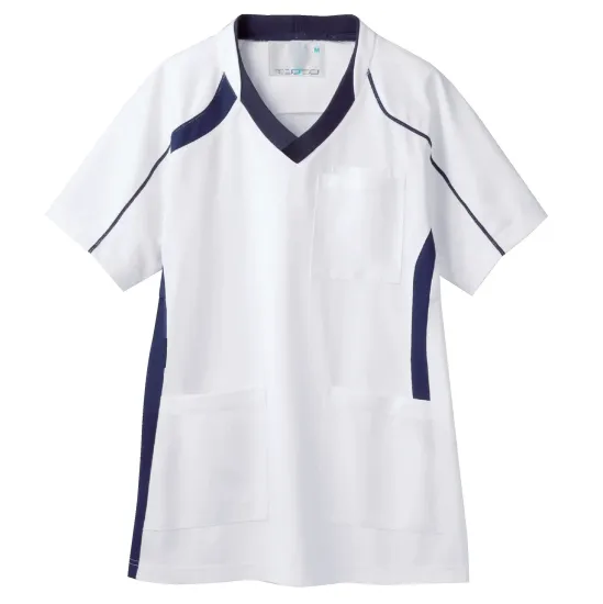 顔まわりをすっきり見せる配色デザインの男女兼用スクラブ。シワになりにくく汚れも付きにくい、お手入れがしやすい素材です。