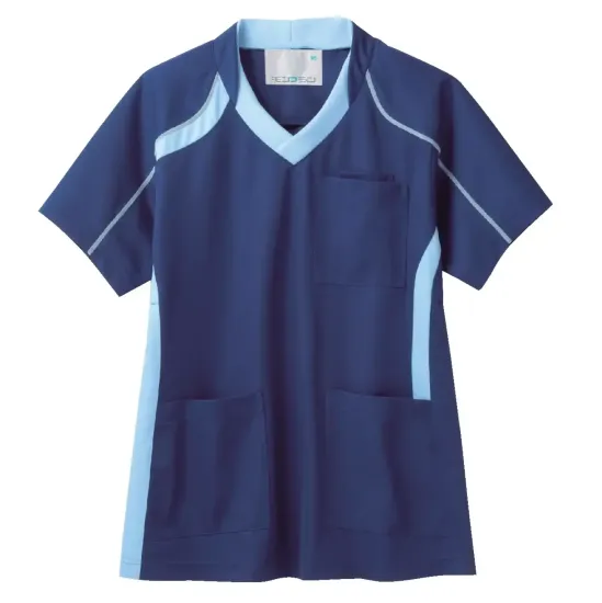 顔まわりをすっきり見せる配色デザインの男女兼用スクラブ。シワになりにくく汚れも付きにくい、お手入れがしやすい素材です。