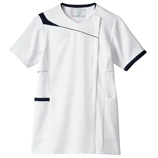 ・着脱しやすい肩口スナップテープ・衣服内の通気性を高める脇下ベンチレーション仕様・PHSや名札ストラップのズレを軽減するストラップホールド・バイカラー配色のアシンメトリーなデザイン・脇ポケットには小物を整理しやすい内ポケット付き・制菌加工により清潔感を保ちやすい