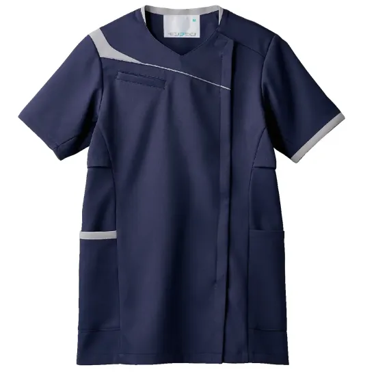 ・着脱しやすい肩口スナップテープ・衣服内の通気性を高める脇下ベンチレーション仕様・PHSや名札ストラップのズレを軽減するストラップホールド・バイカラー配色のアシンメトリーなデザイン・脇ポケットには小物を整理しやすい内ポケット付き・制菌加工により清潔感を保ちやすい