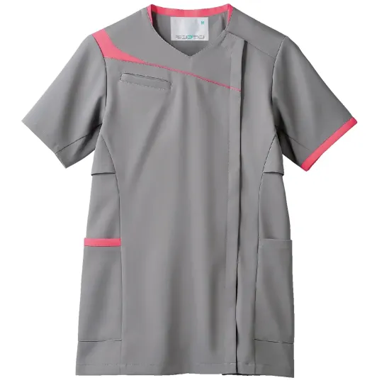 ・着脱しやすい肩口スナップテープ・衣服内の通気性を高める脇下ベンチレーション仕様・PHSや名札ストラップのズレを軽減するストラップホールド・バイカラー配色のアシンメトリーなデザイン・脇ポケットには小物を整理しやすい内ポケット付き・制菌加工により清潔感を保ちやすい