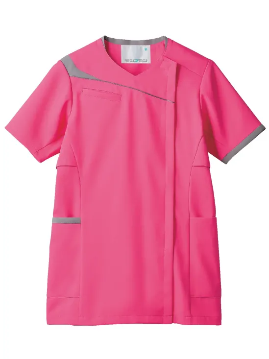 ・着脱しやすい肩口スナップテープ・衣服内の通気性を高める脇下ベンチレーション仕様・PHSや名札ストラップのズレを軽減するストラップホールド・バイカラー配色のアシンメトリーなデザイン・脇ポケットには小物を整理しやすい内ポケット付き・制菌加工により清潔感を保ちやすい