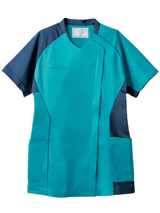 ビビッドカラーとアシンメトリーデザインが目を引く、スポーティな印象のレディーススクラブ。高いストレッチ性を備えたハイパーストレッチトリコット素材を使用し、動きに合わせてしなやかにフィット。現場でのアクティブな動作を快適にサポートします。