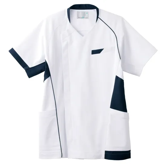 アシンメトリーデザインの男女兼用スクラブ。日勤・夜勤での使い分けにもおすすめ。高いストレッチ性を備えたハイパーストレッチトリコット素材が、動きやすさと快適な着心地を両立します。