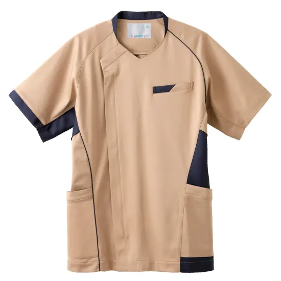 アシンメトリーデザインの男女兼用スクラブ。日勤・夜勤での使い分けにもおすすめ。高いストレッチ性を備えたハイパーストレッチトリコット素材が、動きやすさと快適な着心地を両立します。