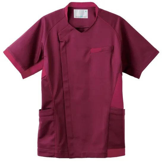 アシンメトリーデザインの男女兼用スクラブ。日勤・夜勤での使い分けにもおすすめ。高いストレッチ性を備えたハイパーストレッチトリコット素材が、動きやすさと快適な着心地を両立します。