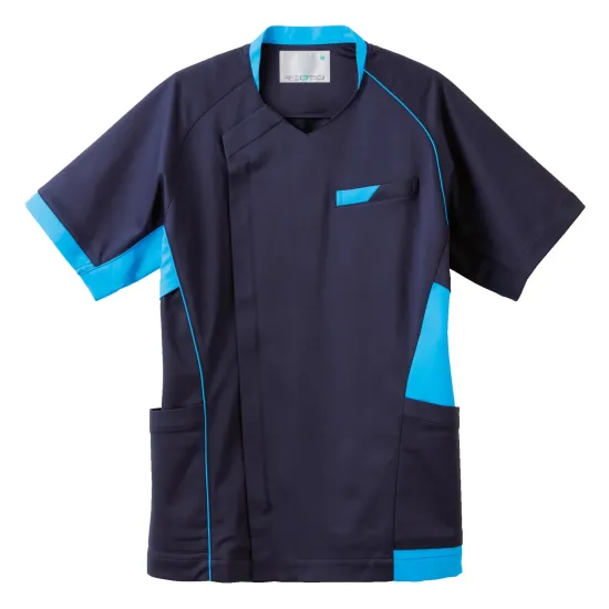 アシンメトリーデザインの男女兼用スクラブ。日勤・夜勤での使い分けにもおすすめ。高いストレッチ性を備えたハイパーストレッチトリコット素材が、動きやすさと快適な着心地を両立します。