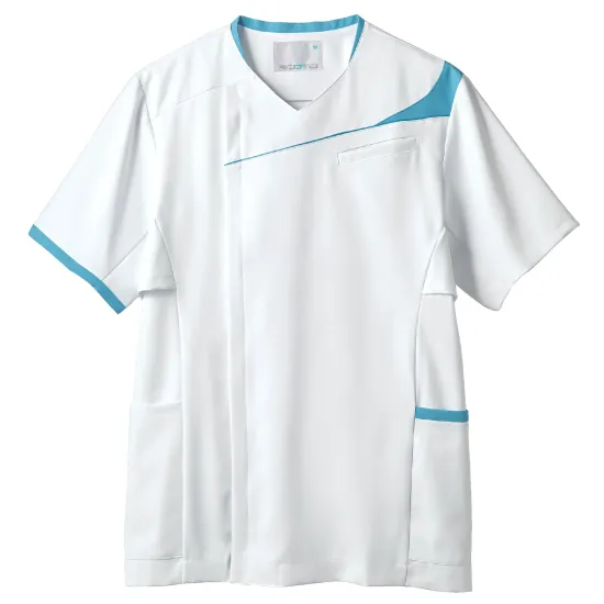 ・着脱しやすい肩口スナップテープ・衣服内の通気性を高める脇下ベンチレーション仕様・PHSや名札ストラップのズレを軽減するストラップホールド・バイカラー配色のアシンメトリーなデザイン・脇ポケットには小物を整理しやすい内ポケット付き・制菌加工により清潔感を保ちやすい