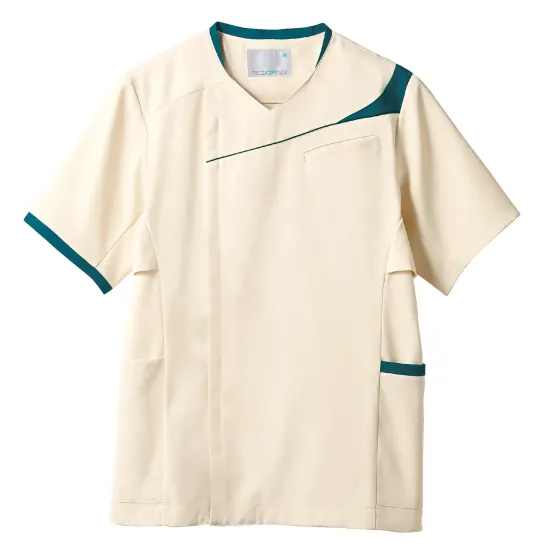 ・着脱しやすい肩口スナップテープ・衣服内の通気性を高める脇下ベンチレーション仕様・PHSや名札ストラップのズレを軽減するストラップホールド・バイカラー配色のアシンメトリーなデザイン・脇ポケットには小物を整理しやすい内ポケット付き・制菌加工により清潔感を保ちやすい