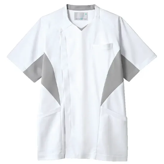 動きやすさと清潔感を兼ね備えたメンズ半袖スクラブ。約3倍のストレッチ性を持つハイパーストレッチトリコットを使用し、快適な着心地を実現。配色ラインの視覚効果でシャープな印象を与え、すっきりとしたシルエットでスマートに着こなせます。