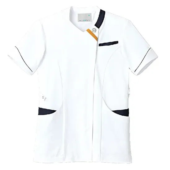 クラシカルとモダンを融合させた男女兼用ジャケットです。微光沢のある上質な生地が顔まわりを明るく見せ清潔感と品の良さを演出します。曲線のカットや配色で柔らかな印象を与え患者様からの印象もアップ。