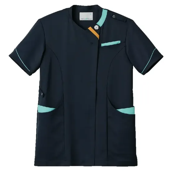 クラシカルとモダンを融合させた男女兼用ジャケットです。微光沢のある上質な生地が顔まわりを明るく見せ清潔感と品の良さを演出します。曲線のカットや配色で柔らかな印象を与え患者様からの印象もアップ。