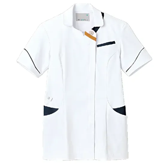 ・上品な微光沢で顔うつりを綺麗に明るく見せるライトフィックス®ツイル素材・肩甲骨まわりの突っ張りを軽減する機能性パターン設計・襟元のテープの出し入れで日勤夜勤を切り替えられる・長めのスリット入りで動きやすいサイドベンツ入り・左右のウエストに鍵や消毒液を掛けられるループ付き・肩から斜め掛けできる角度付きループで消毒液ポーチも安定・左胸にPHSの落下を防ぐポケットを装備・左肩部分にストラップが肌に直接当たりにくいループ付き・ポケットはインクが表に染み出しにくい仕様