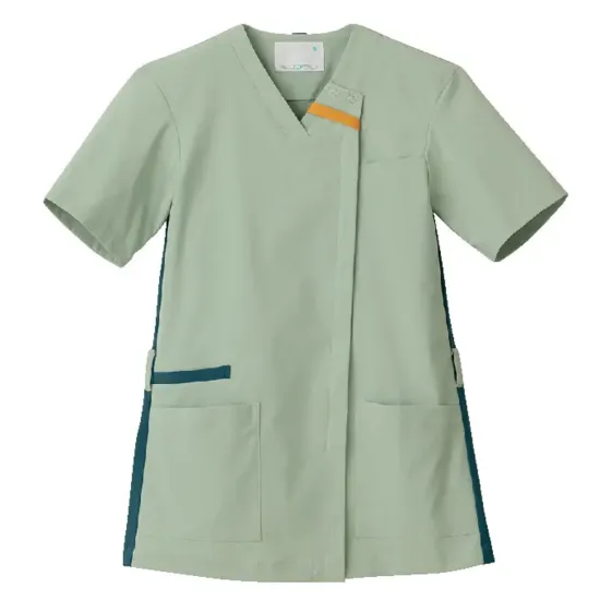 ・天然繊維のようなマットな質感と軽量・ストレッチ性を持つタスランストレッチトロ素材を採用・襟元のテープの出し入れで日勤夜勤を切り替えられる・肩甲骨まわりの突っ張り感を軽減する機能性パターン設計・PHSなどのストラップが肌に直接触れにくいループ付き・右脇ポケットはスマートフォンなど重量のある小物も収納可能・左腰ポケットに小物を整理しやすい内ポケット付き・左右ウエストに鍵や消毒液などを掛けられるループ付き・長めのスリットで動きやすいサイドベンツ入り