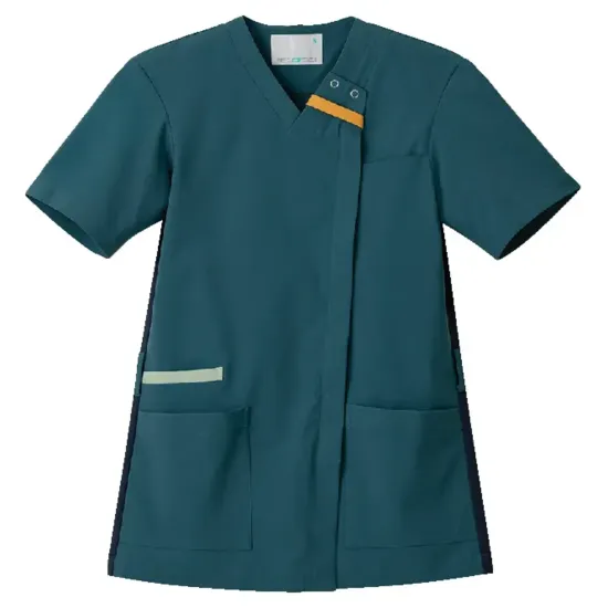 ・天然繊維のようなマットな質感と軽量・ストレッチ性を持つタスランストレッチトロ素材を採用・襟元のテープの出し入れで日勤夜勤を切り替えられる・肩甲骨まわりの突っ張り感を軽減する機能性パターン設計・PHSなどのストラップが肌に直接触れにくいループ付き・右脇ポケットはスマートフォンなど重量のある小物も収納可能・左腰ポケットに小物を整理しやすい内ポケット付き・左右ウエストに鍵や消毒液などを掛けられるループ付き・長めのスリットで動きやすいサイドベンツ入り