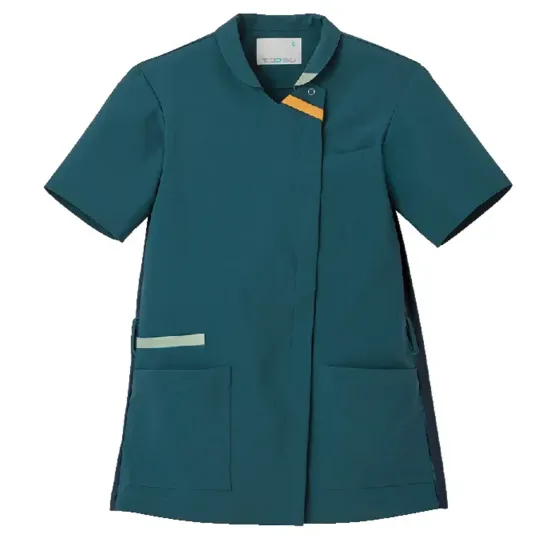男女を問わず着こなせるベーシックデザインに小さな襟とサイド配色を効かせたZIP-UPタイプの男女兼用スクラブ。タスランストレッチトロ素材を使用しポリエステル100%ながら天然繊維のような質感と軽さを実現。伸縮性と吸汗速乾性に優れ忙しい現場でも快適な着用感を保ちます。