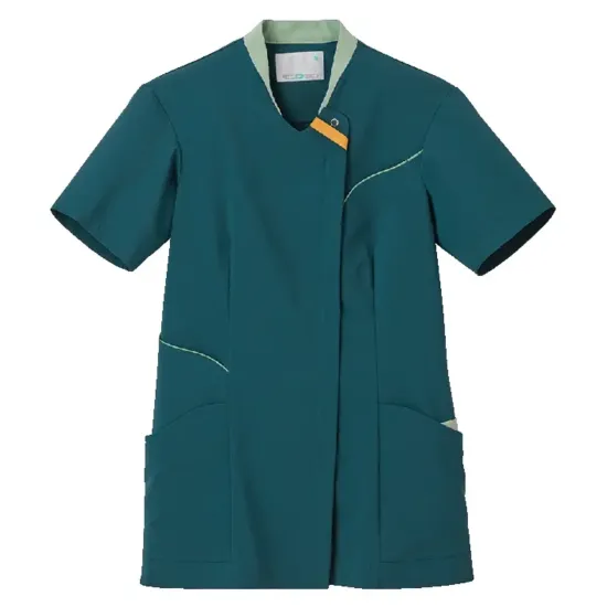 ・天然繊維のようなマットな風合いと軽さとストレッチ性を備えたタスランストレッチトロ素材を使用・日勤夜勤がひと目で分かる配色切替仕様でテープの出し入れにより簡単チェンジ・肩甲骨まわりの突っ張り感を軽減する機能性パターン設計・PHSなどのストラップが肌に直接触れにくいループ付き・右脇ポケットは重量のあるスマートフォンなども収納可能・左腰ポケットに小物を整理しやすい内ポケット付き・左右ウエストに鍵や消毒液などを掛けられるループ付き・長めのスリットで動きやすいサイドベンツ入り