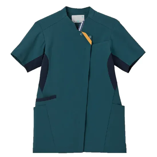 襟元や脇配色をシャープにまとめたスポーティな印象の男女兼用スクラブ。タスランストレッチトロ素材を使用しポリエステル100%ながら天然繊維のような質感と軽さを実現。高い伸縮性と吸汗速乾性で涼やかな着用感を保ち忙しい現場でも快適に動けます。