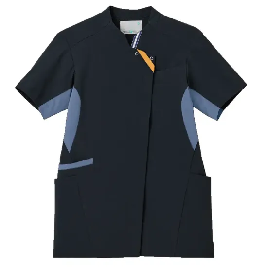 ・天然繊維のようなマットな風合いと軽さを備えたタスランストレッチトロ素材を採用・動きに沿って伸びる高ストレッチ性で作業中の負担を軽減・日勤夜勤がひと目で分かる配色切替仕様でテープの出し入れにより簡単チェンジ・肩甲骨まわりの突っ張り感を軽減する機能性パターン設計・PHSなどのストラップが肌に直接触れにくいループ付き・右脇ポケットは重量のあるスマートフォンなども収納可能・左腰ポケットに小物を整理しやすい内ポケット付き・左右ウエストに鍵や消毒液などを掛けられるループ付き・長めのスリットで動きやすいサイドベンツ入り