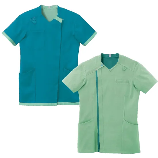 ・表裏で色が異なるリバーシブル素材でシフト管理を色で見える化・一着で二通り使えるため貸与枚数削減と保管スペース縮小に貢献・肩甲骨まわりの突っ張りを軽減する機能性パターン設計・着脱が簡単なワンタッチボタン仕様・PHSなどのストラップが肌に直接触れにくいループ付き・左ウエストに鍵や消毒液などが掛けられる便利なループ付き・胸腰ポケットは表裏で袋がつながり入れ替えや出し忘れを防止・サイズ識別テープと管理ラベル圧着用タグ付き