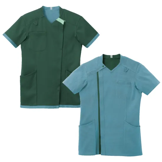 ・表裏で色が異なるリバーシブル素材でシフト管理を色で見える化・一着で二通り使えるため貸与枚数削減と保管スペース縮小に貢献・肩甲骨まわりの突っ張りを軽減する機能性パターン設計・着脱が簡単なワンタッチボタン仕様・PHSなどのストラップが肌に直接触れにくいループ付き・左ウエストに鍵や消毒液などが掛けられる便利なループ付き・胸腰ポケットは表裏で袋がつながり入れ替えや出し忘れを防止・サイズ識別テープと管理ラベル圧着用タグ付き