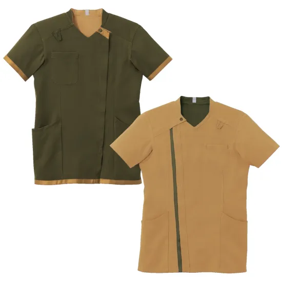 ・表裏で色が異なるリバーシブル素材でシフト管理を色で見える化・一着で二通り使えるため貸与枚数削減と保管スペース縮小に貢献・肩甲骨まわりの突っ張りを軽減する機能性パターン設計・着脱が簡単なワンタッチボタン仕様・PHSなどのストラップが肌に直接触れにくいループ付き・左ウエストに鍵や消毒液などが掛けられる便利なループ付き・胸腰ポケットは表裏で袋がつながり入れ替えや出し忘れを防止・サイズ識別テープと管理ラベル圧着用タグ付き