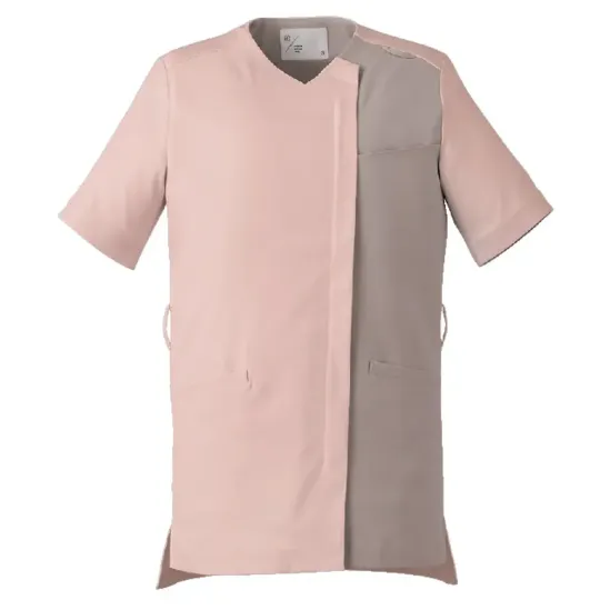 バイカラー配色が印象的な男女兼用ジップアップスクラブ。ストレッチダブルクロス素材を使用しポリエステル100%ながら動きやすさと上質感を両立し医療・サービス現場に洗練された印象を与えます。